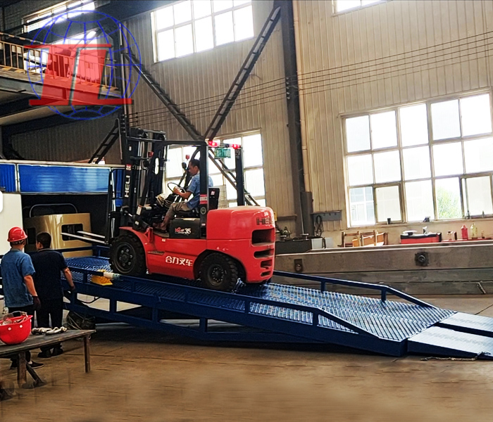 移动式登车桥广泛用于无装卸设备的货台及流动装卸场所,是与叉车配合使用的货物装卸辅助设备。借助移动式登车桥,叉车能直接驶入汽车集装箱内部进行批量装卸作业。只需单人操作,不需动力电源,即可实现货物的安全快速装卸