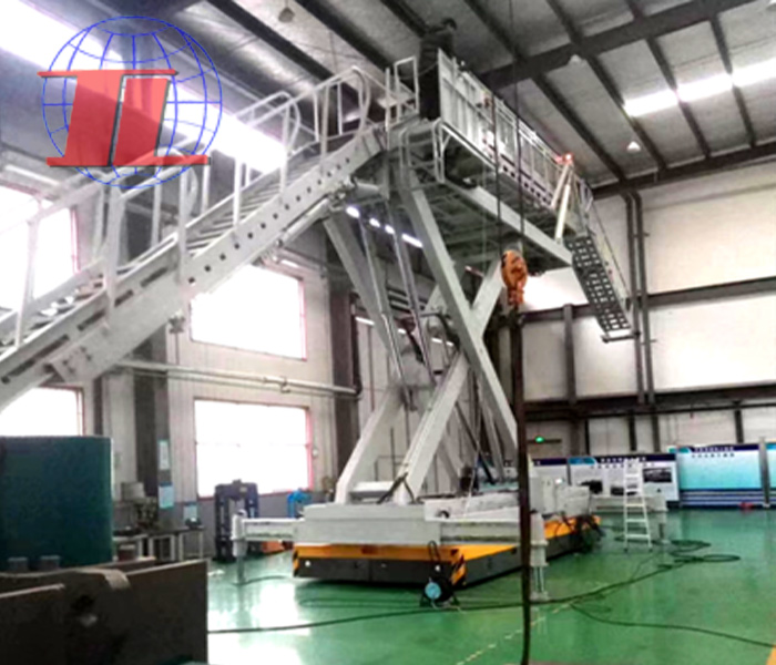 当需要使用登舰平台时,操作人员启动液压泵,液压泵从油箱吸取液压油并加压,通过液压管路将高压油输送到液压缸。液压缸内的活塞在高压油作用下产生推力,推动剪叉臂逐渐展开,使平台上升至与舰艇甲板平齐的高度 。操作人员通过控制液压阀调节液压油的流量和压力,控制平台的升降速度和高度。在平台上升或下降过程中,传感器实时监测平台的高度、载重等参数,并反馈给控制系统,确保运行安全。当平台到达合适位置后,通过移动底座将平台与舰艇甲板对接,人员即可通过登舰通道安全登舰 。