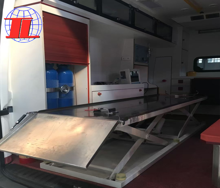 120 急救车升降平台采用医用级不锈钢材质打造,整体呈银色金属质感,台面长 2 米、宽 0.6 米,表面布满菱形防滑纹路,可有效防止担架在转运中打滑。平台两侧配备可折叠式护栏,展开高度达 30 厘米,收起时贴合台面边缘,不占用舱内空间。升降系统采用静音液压驱动,升降过程噪音低于 50 分贝,避免对患者造成二次惊扰。